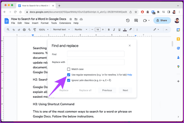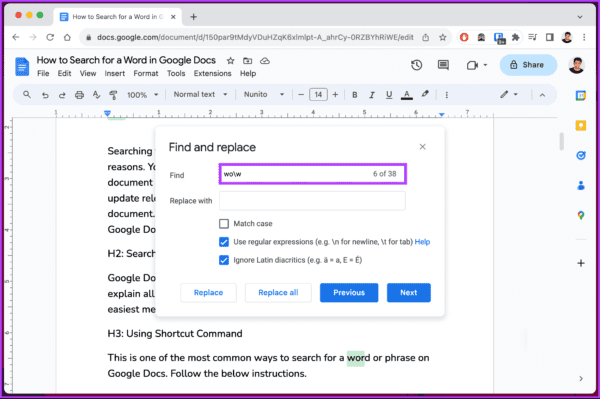 Google Docs tiene una potente función para buscar y manipular texto mediante expresiones regulares, comúnmente conocidas como RegEx. A diferencia de las búsquedas de texto simples, con RegEx puede buscar palabras o patrones dentro de su documento usando secuencias de caracteres que definen un patrón de búsqueda.