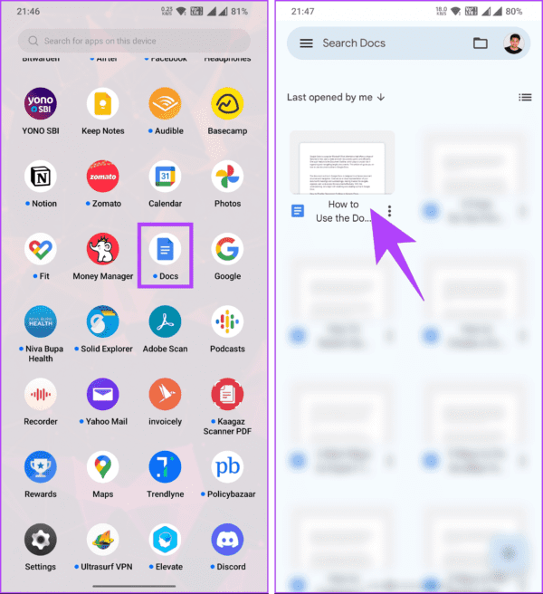 Paso 1: inicie la aplicación Google Docs en su dispositivo Android o iOS. Luego, navegue hasta el documento donde desea buscar una palabra o frase.