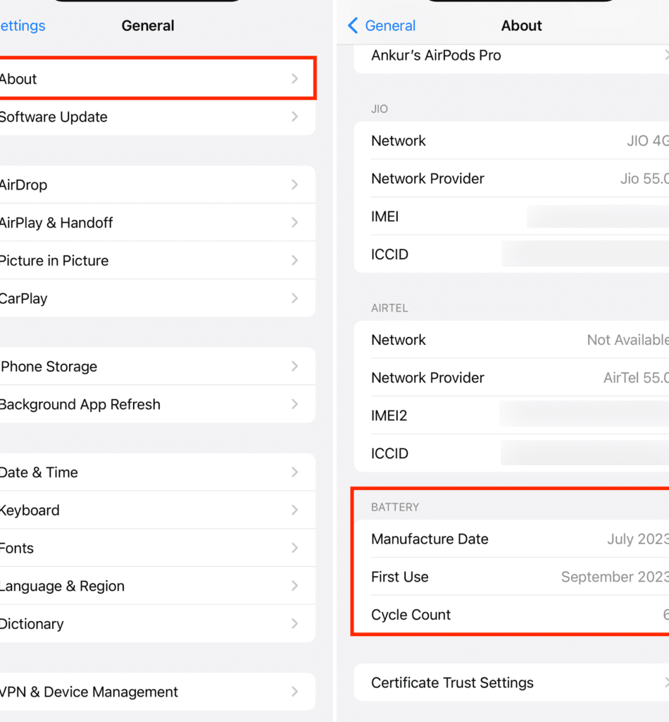 Debajo de la sección de datos técnicos, puedes encontrar el recuento de ciclos de carga de tu iPhone junto a Ciclos de carga de la batería.